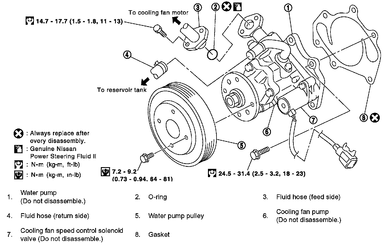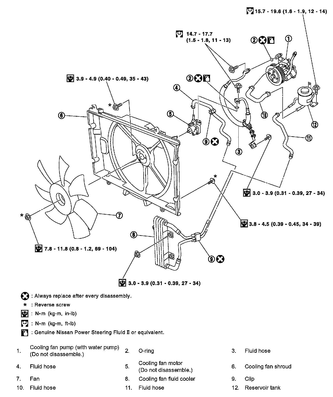 Reservoir tank (Cooling fan pump) 15.7 - 19.6 Nm (1.6 - 1.9 kg-m, 12 - 14 ft. lbs.)
