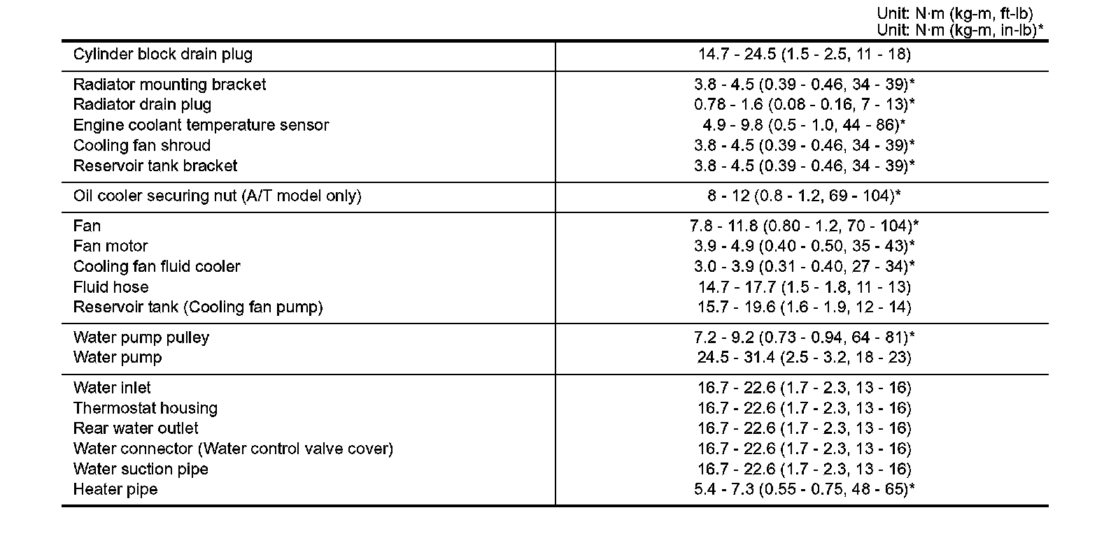 Radiator drain plug 0.78 - 1.6 Nm (0.08 - 0.16 kg-m, 7- 13 inch lbs.)