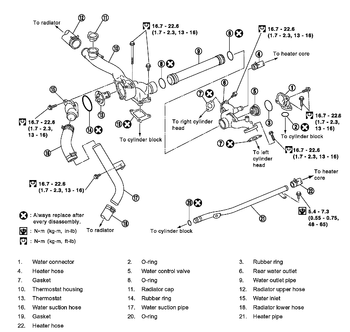 Thermostat housing 16.7 - 22.6 Nm (1.7 - 2.3 kg-m, 13 - 16 ft. lbs.)