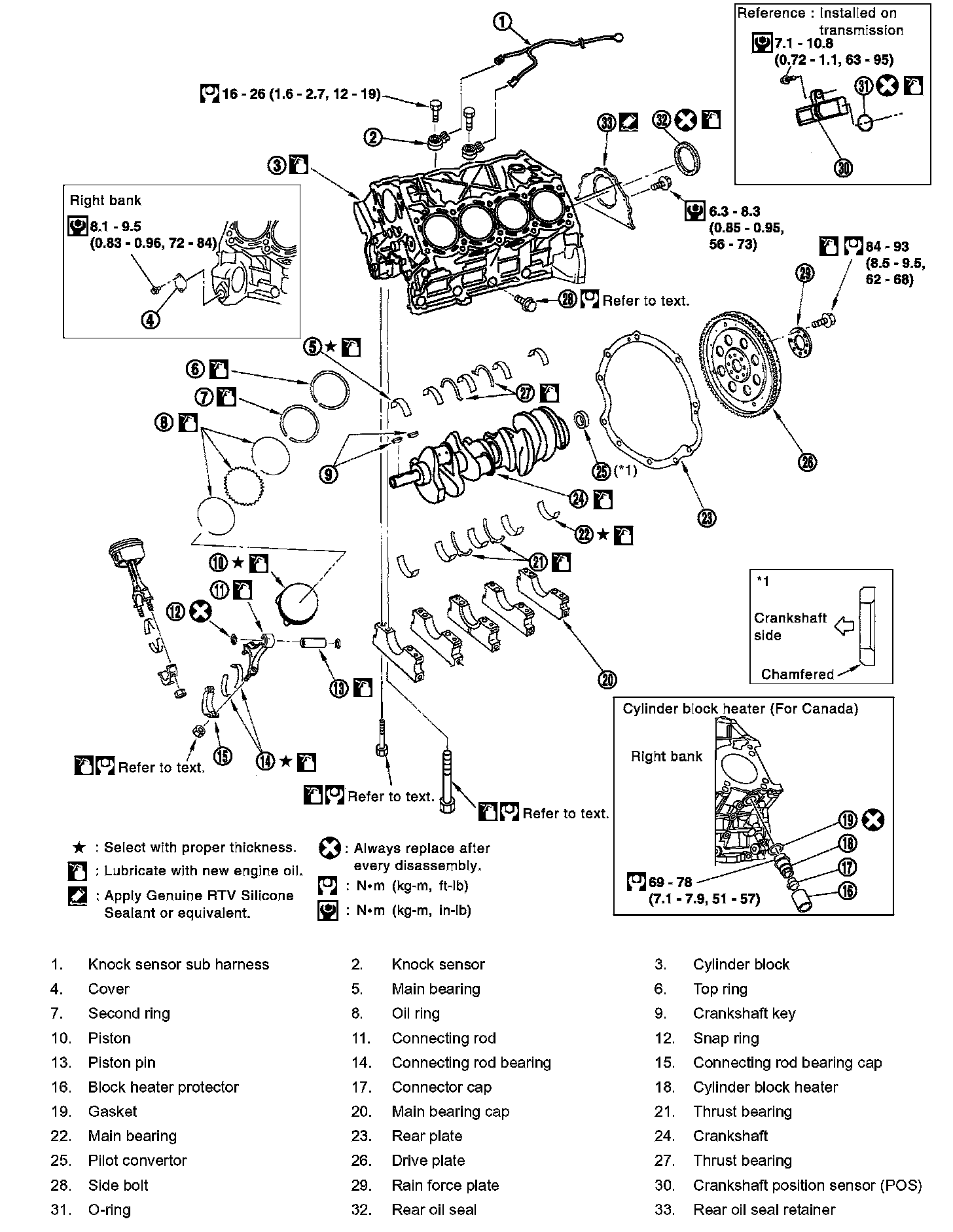 Cylinder block drain plug 14.7 - 24.5 Nm (1.5 - 2.5 kg-m, 11 - 18 ft. lbs.)