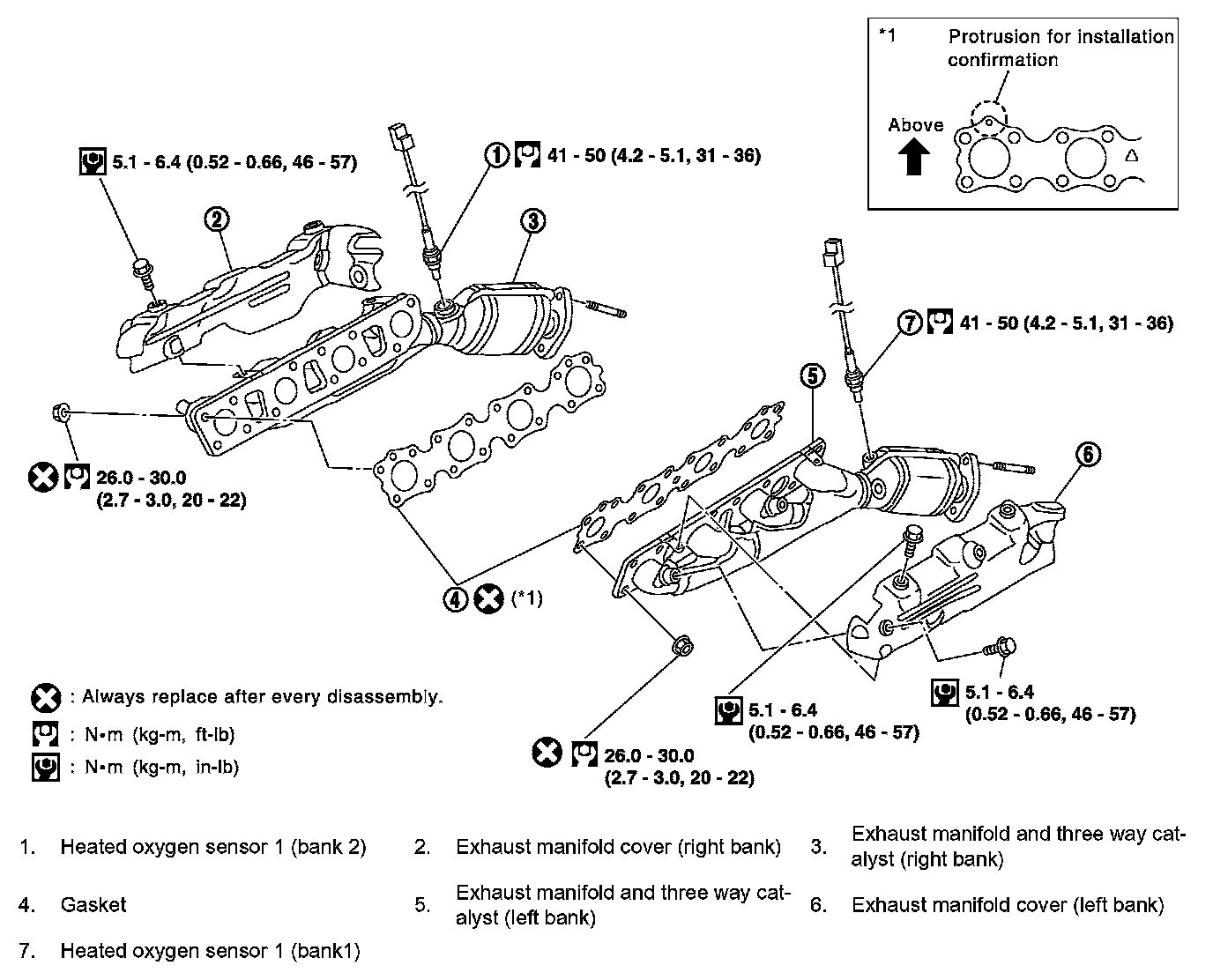 Exhaust manifold cover 5.1 - 6.4 Nm (0.52 - 0.66 kg-m, 46 - 57 ft. lbs.)