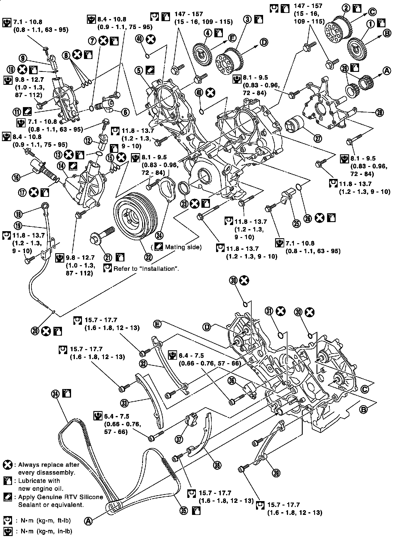 Timing chain tension guide 15.7 - 17.7 Nm (1.6 - 1.8 kg-m, 12 - 13 ft. lbs.)