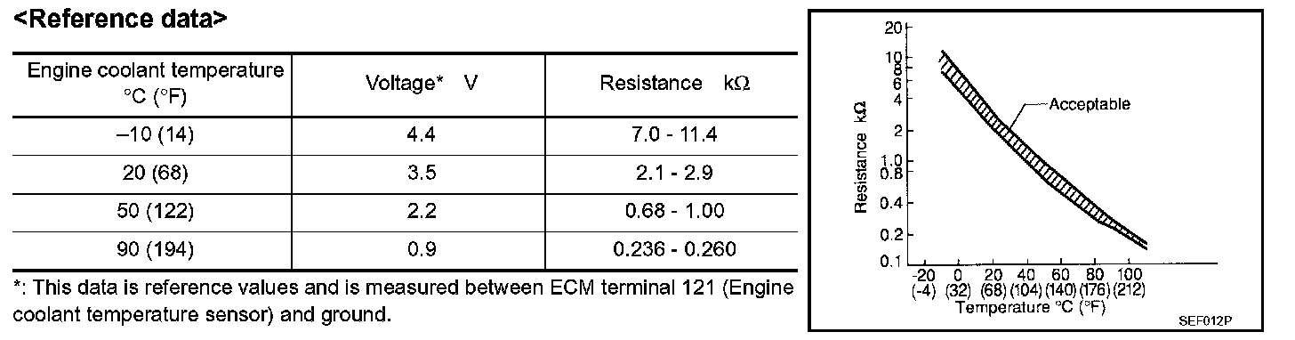 The engine coolant temperature sensor is used to detect the engine coolant temperature. The sensor modifies a voltage signal from the ECM. The modified signal returns to the ECM as the engine coolant temperature input. The sensor uses a thermistor which is sensitive to the change in temperature. The electrical resistance of the thermistor decreases as temperature increases.