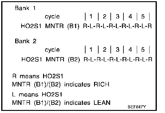 - "HO2S1 MNTR (B1)/(B2)" in "DATA MONITOR" mode changes from "RICH" to "LEAN" to "RICH" more than 5 times in 10 seconds.