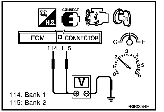 2. Set voltmeter probes between ECM terminal 114 [HO2S1 (B1) signal] or 115 [HO2S1 (B2) signal] and ground.