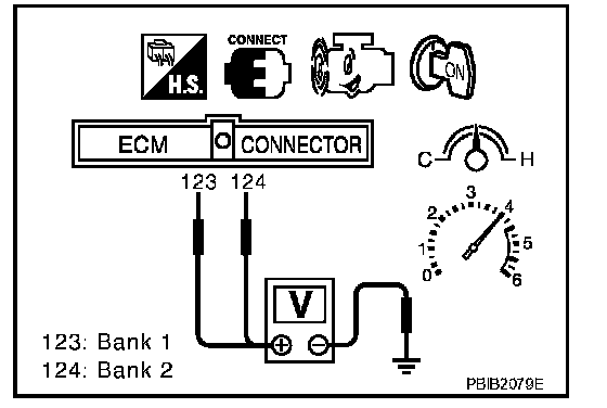 5. Set voltmeter probes between ECM terminal 123 [HO2S2 (B1) signal] or 124 [HO2S2 (B2) signal] and ground.