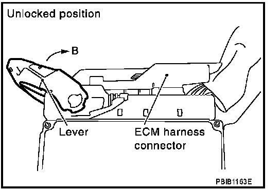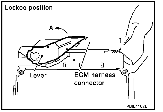 - When connecting ECM harness connector, fasten it securely with a lever as far as it will go as shown in the figure.