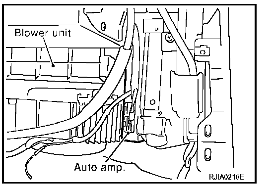 The auto amplifier has a built-in microcomputer which processes information sent from various sensors needed for air conditioner operation. The air mix door motor, mode door motor, intake door motor, blower motor and compressor are then controlled. The auto amplifier is unitized with control mechanisms. When the various switches and temperature adjustment dial are operated, data is input to the auto amp. from the AV control unit or AV and NAVI control unit using multiplex communication. Self-diagnostic functions are also built into auto amplifier to provide quick check of malfunctions in the auto air conditioner system.