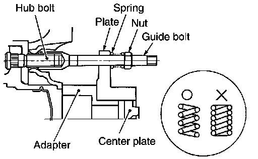 4. Insert plate (special service tool) on guide bolt (special service tool). Put spring in, and then evenly screw in guide bolt nut (special service tool). When fastening guide bolt nut, do not completely compress spring.