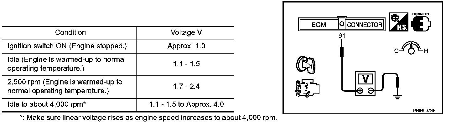 3. Check voltage between ECM terminal 91 (Mass air flow sensor signal) and ground.