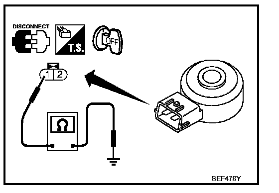 Check resistance between knock sensor terminal 1 and ground.