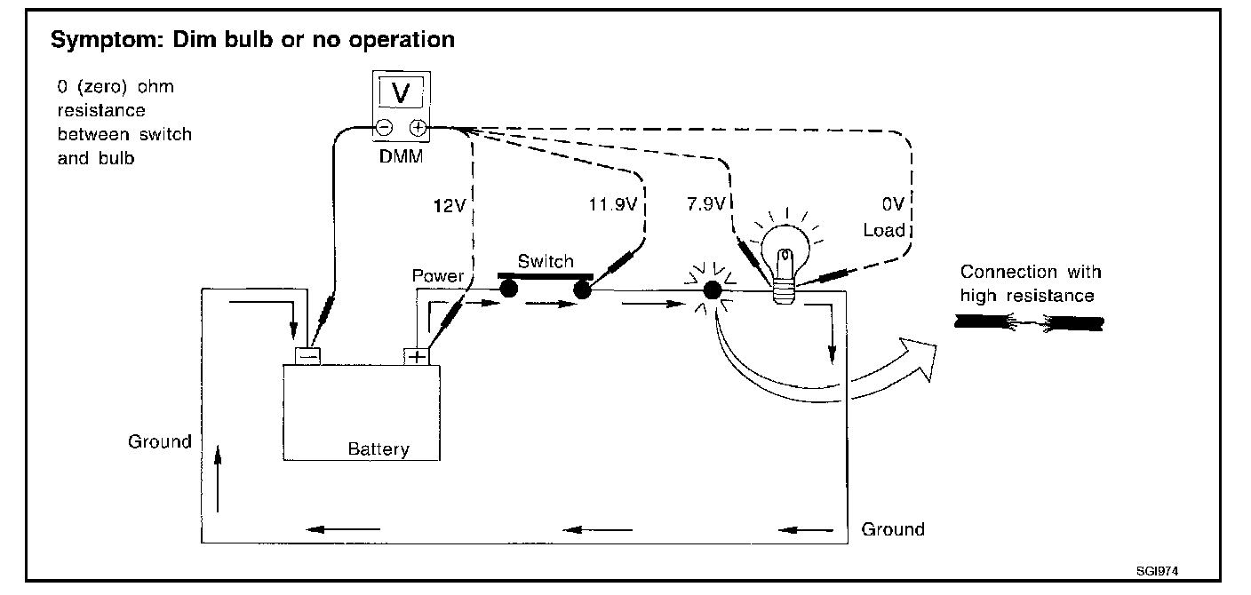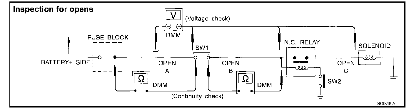 - Connect the other probe to the fuse block (power) side of SW1. Little or no resistance will indicate that portion of the circuit has good continuity. If there were an open in the circuit, the DMM would indicate an over limit or infinite resistance condition. (point A)