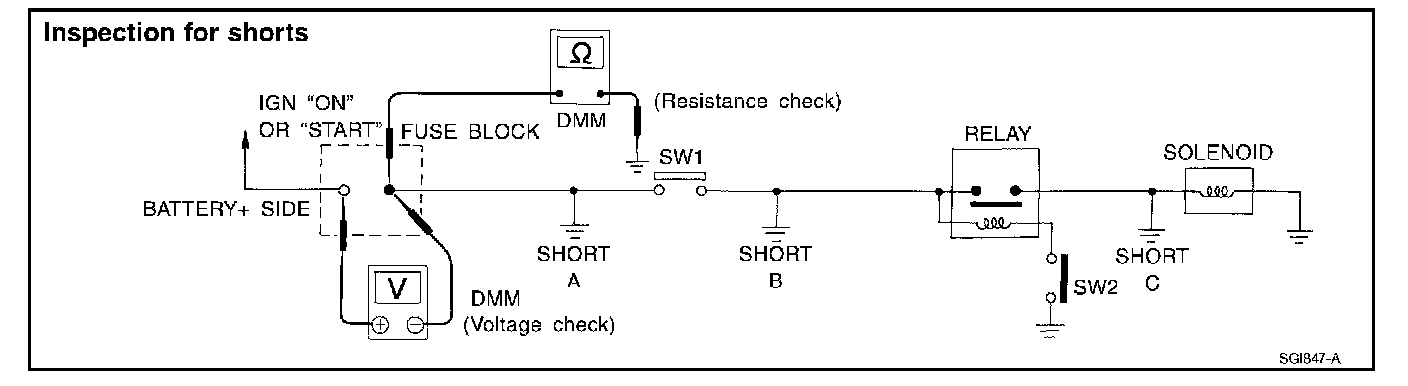 - Close SW1 and disconnect the relay. Put probes at the load side of fuse terminal and a known good ground. Then, check for continuity. continuity; short is between SW1 and the relay (point B).