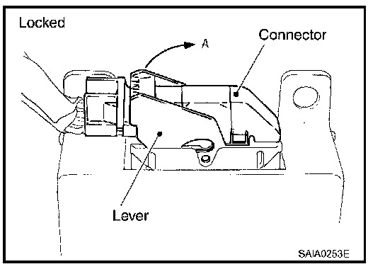 - For removal of the lever type connector, pull the lever up to the direction pointed to by the arrow A in the figure, and then remove the connector.