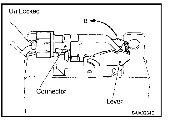 - For installation of the lever type connector, pull down the lever to the direction pointed by the arrow B in the figure, and then push the connector until a clicking noise is heard.