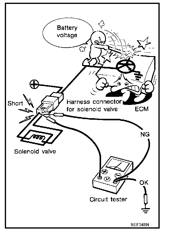 voltage; short is down the circuit of the relay or between the relay and the disconnected solenoid (point C).
