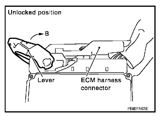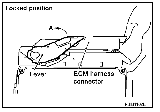 - When connecting ECM harness connector, fasten it securely with a lever as far as it will go as shown in the figure.