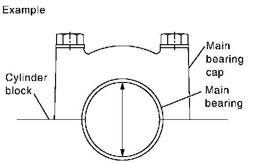 ^ Install main bearings to cylinder block and main bearing cap. Measure the main bearing inner diameter with the bearing cap bolt tightened to the specified torque. Refer to "ASSEMBLY".