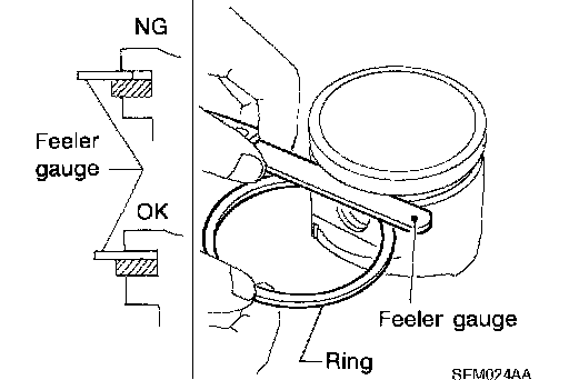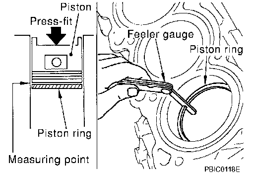 ^ Lubricate with new engine oil to piston and piston ring, and then insert piston ring until middle of cylinder with piston, and measure piston ring end gap with feeler gauge.