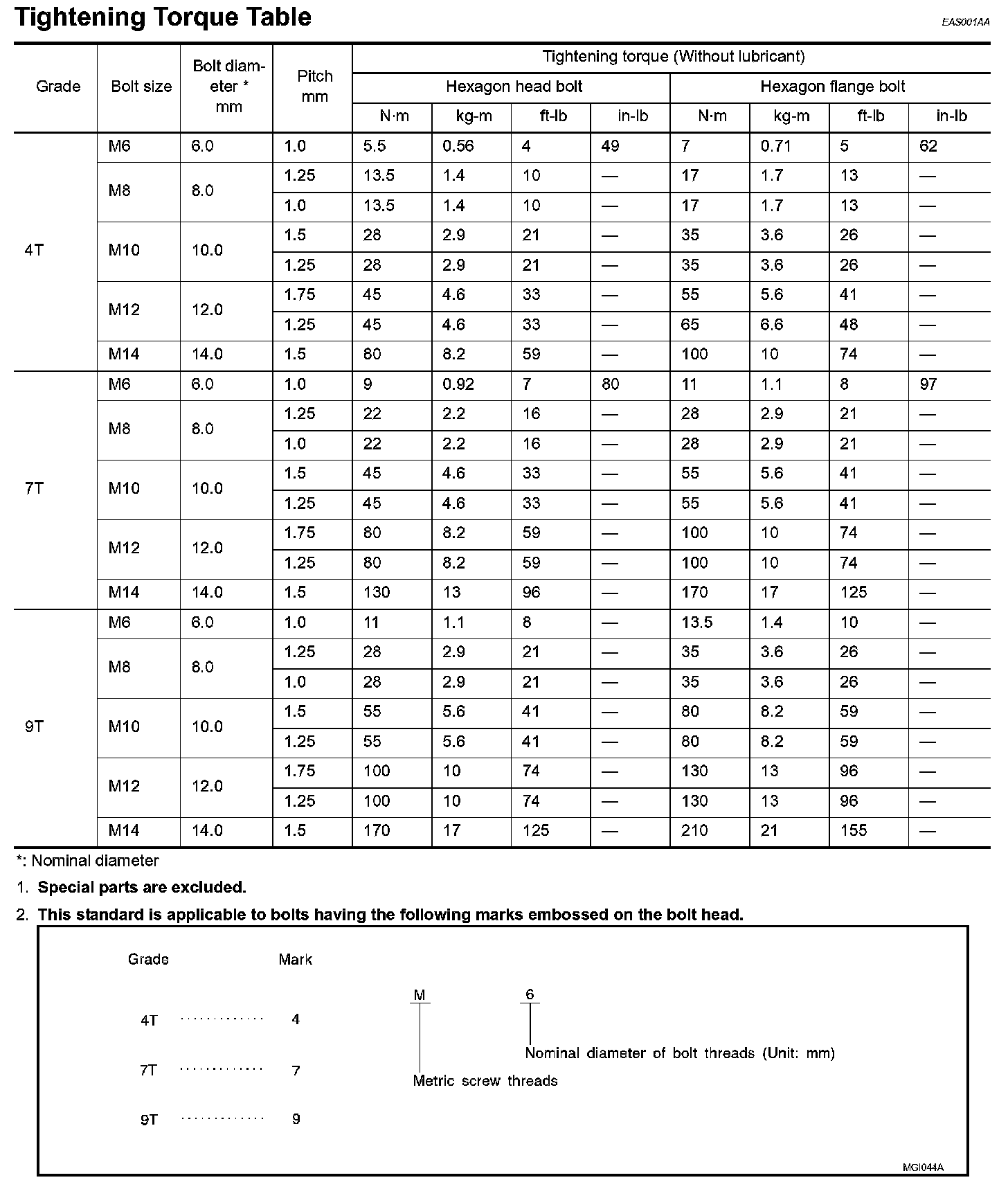Tightening Torque Of Standard Bolts: