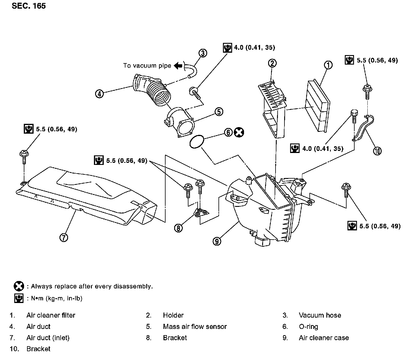 4. Remove air duct (inlet), air duct and air cleaner case assembly disconnecting their joints.