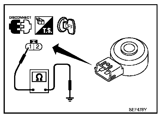 Check resistance between knock sensor terminal 1 and ground.