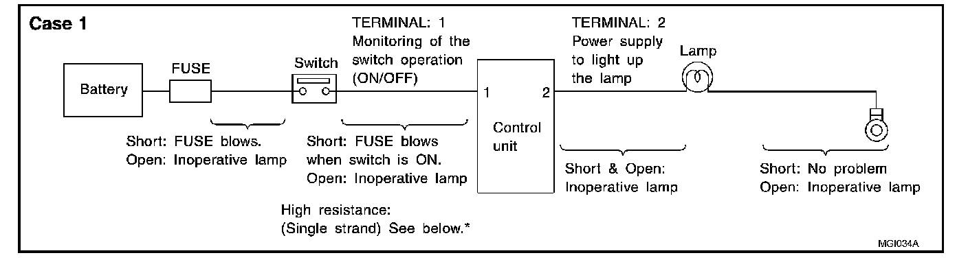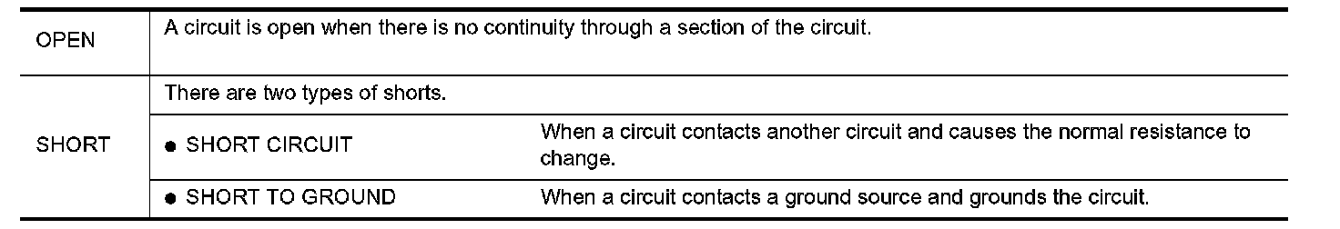 The continuity check is used to find an open in the circuit. The digital multimeter (DMM) set on the resistance function will indicate an open circuit as over limit (no beep tone or no ohms symbol). Make sure to always start with the DMM at the highest resistance level. To help in understanding the diagnosis of open circuits, please refer to the previous schematic.