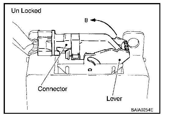 - For installation of the lever type connector, pull down the lever to the direction pointed by the arrow B in the figure, and then push the connector until a clicking noise is heard.