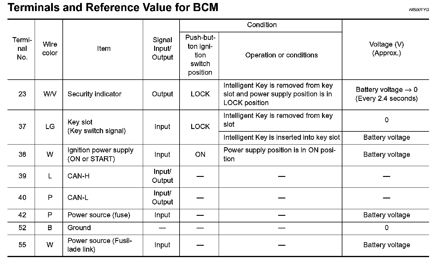 Terminals And Reference Value For BCM: