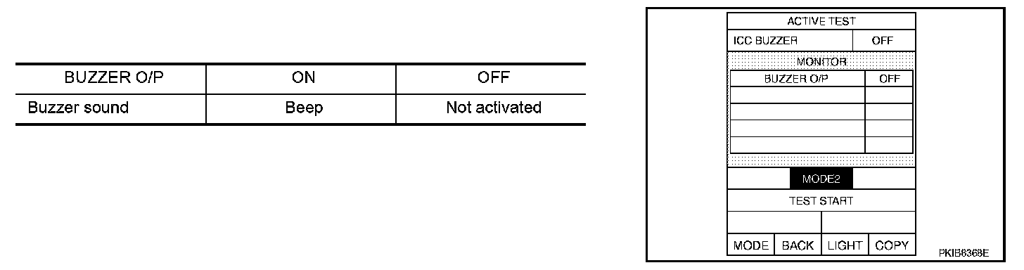 Touch "TEST START" and "RESET" in "MODE2" to check if ICC warning chime operates as in the given chart.