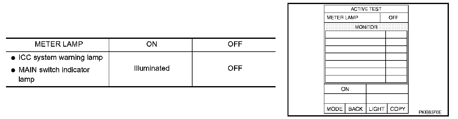 - Touch "ON" and "OFF" to check if MAIN switch indicator lamp and ICC system warning lamp illuminate as in the given chart.