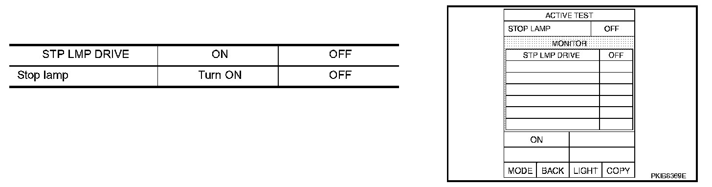 Touch "ON" and "OFF" to check if stop lamp operates as in the given chart.