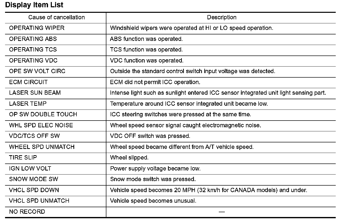 - "CAUSE OF AUTO-CANCEL" displays times of ignition switch ON/OFF up to 254 maximum. 254 is kept though the number exceeds 254. The number returns to 0 when detecting the same cancellation causes.