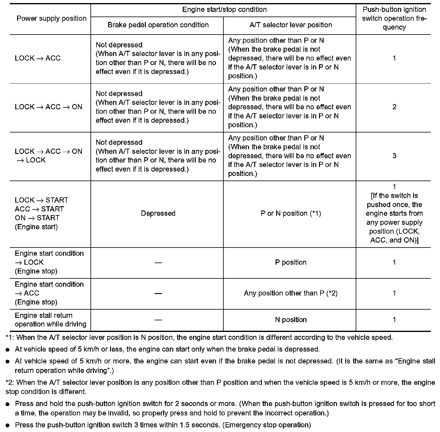 NOTE: The prerequisite for starting the engine varies by the state of brake pedal, A/T selector lever, and vehicle speed.