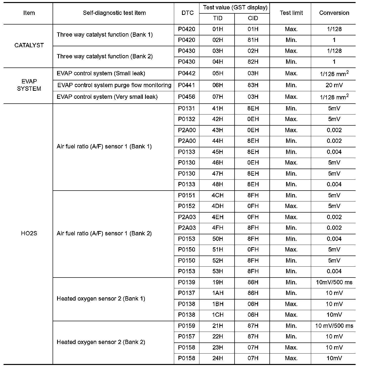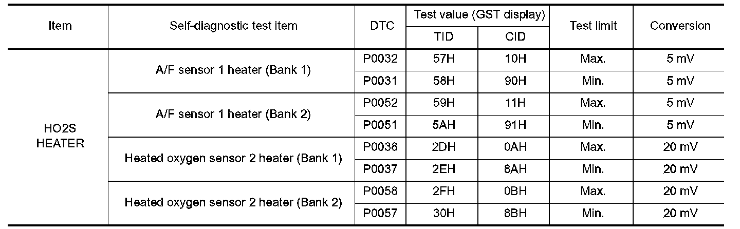 The test value is a parameter used to determine whether a system/circuit diagnostic test is OK or NG while being monitored by the ECM during self-diagnosis. The test limit is a reference value which is specified as the maximum or minimum value and is compared with the test value being monitored.