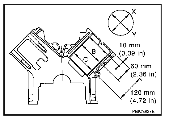 ^ Using bore gauge, measure cylinder bore for wear, out-of-round and taper at six different points on each cylinder. ("X" and "Y" directions at "A", "B" and "C") ("X" is in longitudinal direction of engine)