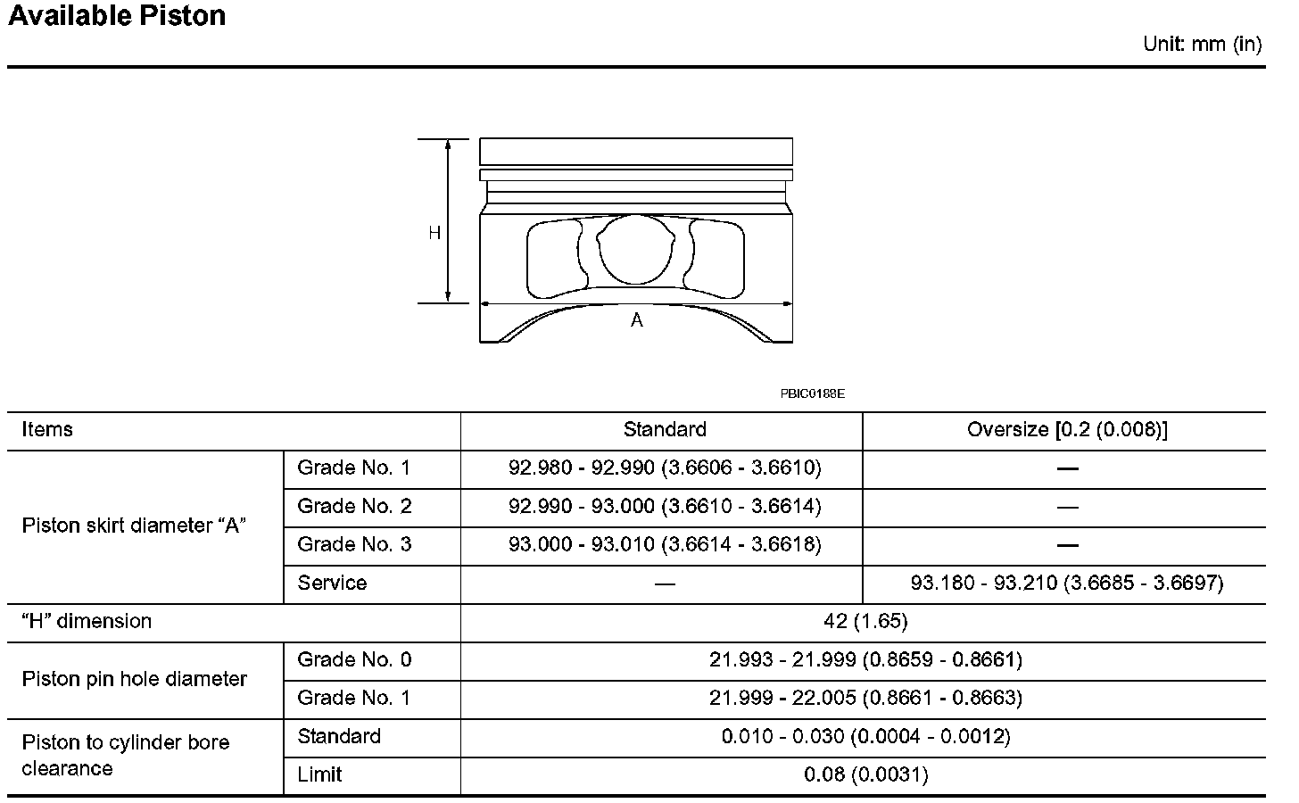 Standard: 92.980 - 93.010 mm (3.6606 - 3.6618 in)