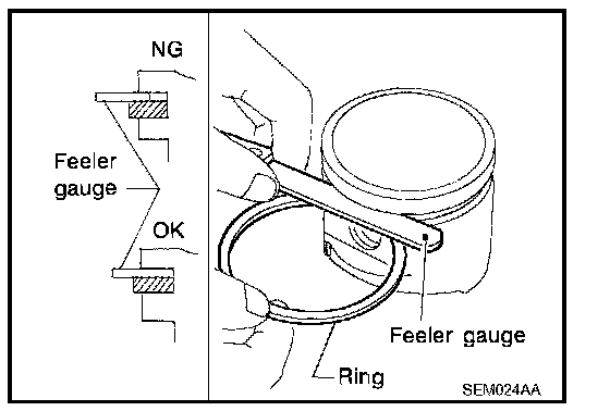 ^ Measure the side clearance of piston ring and piston ring groove with feeler gauge.