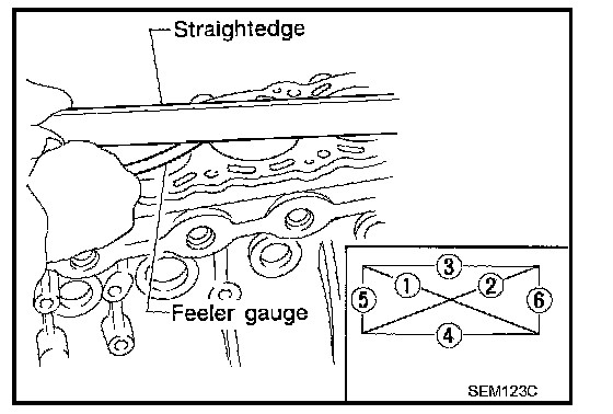 ^ Measure the distortion on the cylinder block upper face at some different points in six directions with straightedge and feeler gauge.