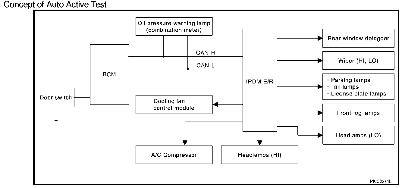 - IPDM E/R actuates auto active test mode when it receives door switch signal from BCM via CAN communication line. Therefore, when auto active test mode is activated successfully, CAN communication between IPDM E/R and BCM is normal.