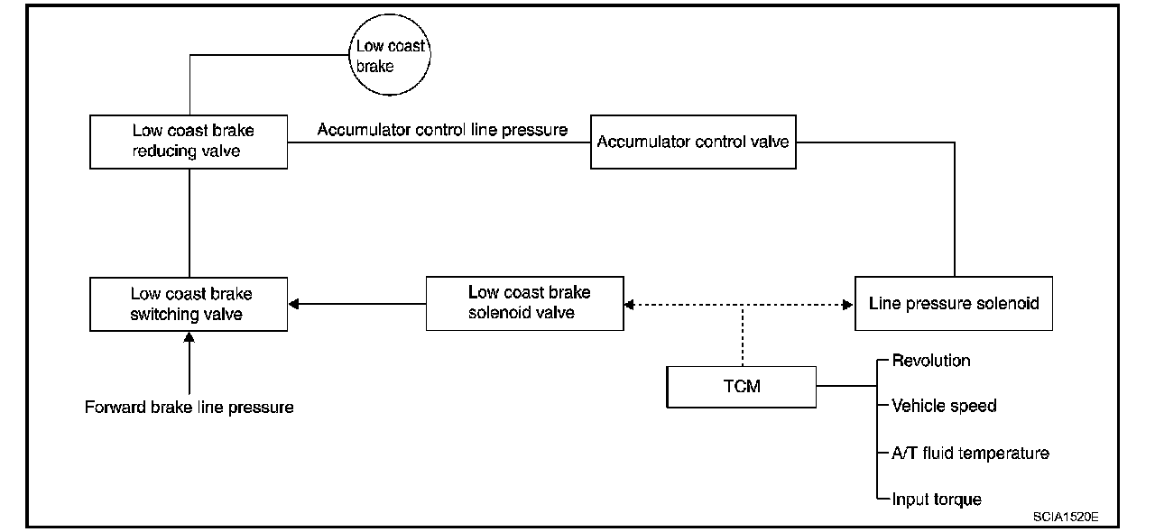 ^ The operation of the low coast brake solenoid switches the low coast brake switching valve and controls the coupling and releasing of the low coast brake. The low coast brake reducing valve controls the low coast brake coupling force.