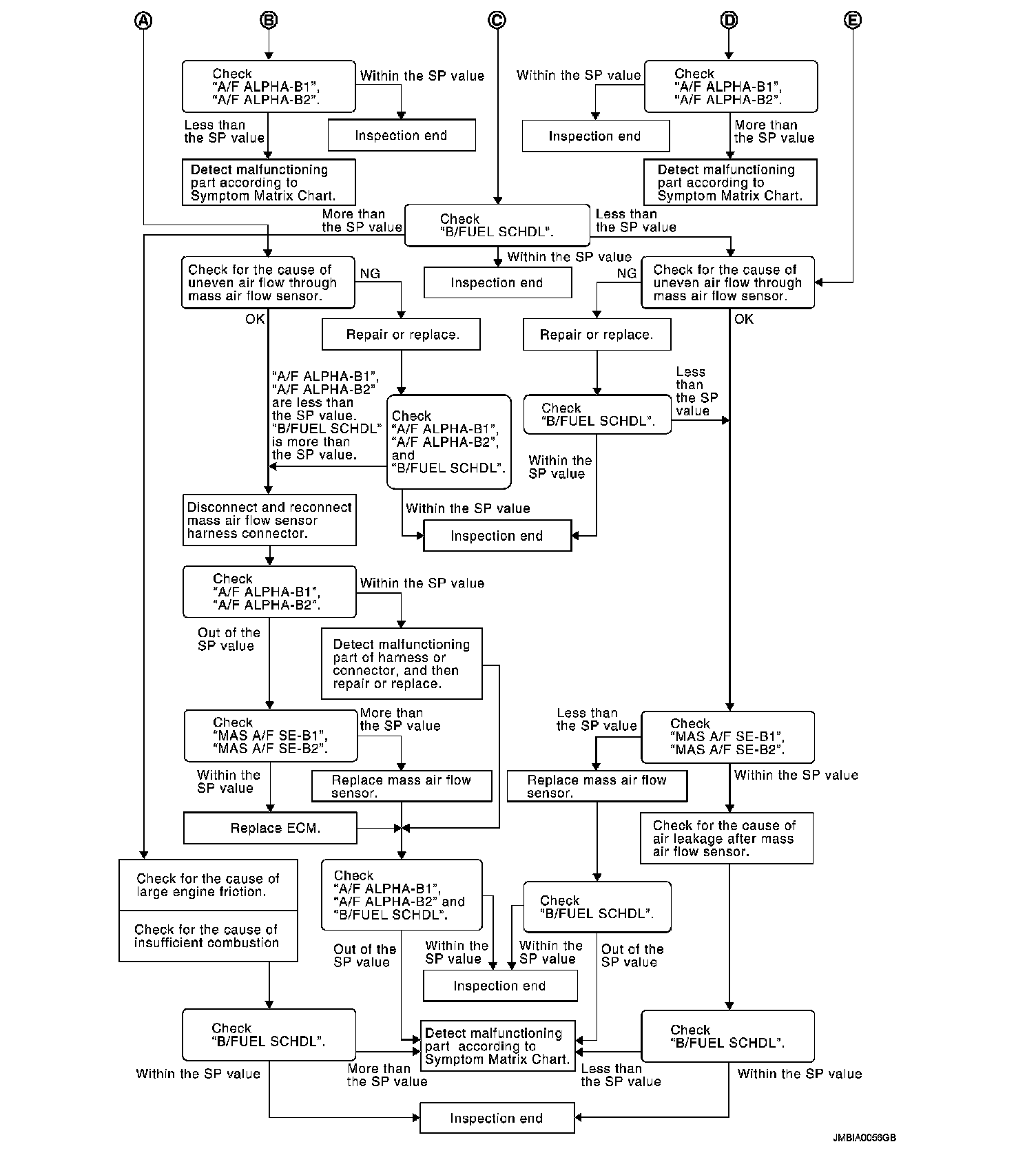 Check "A/F ALPHA-B1", "A/F ALPHA-B2" for approximately 1 minute because they may fluctuate. It is NG if the indication is out of the SP value even a little.