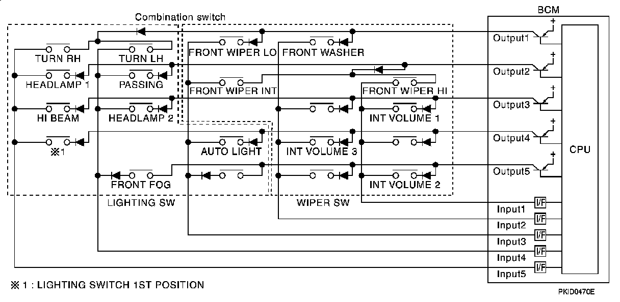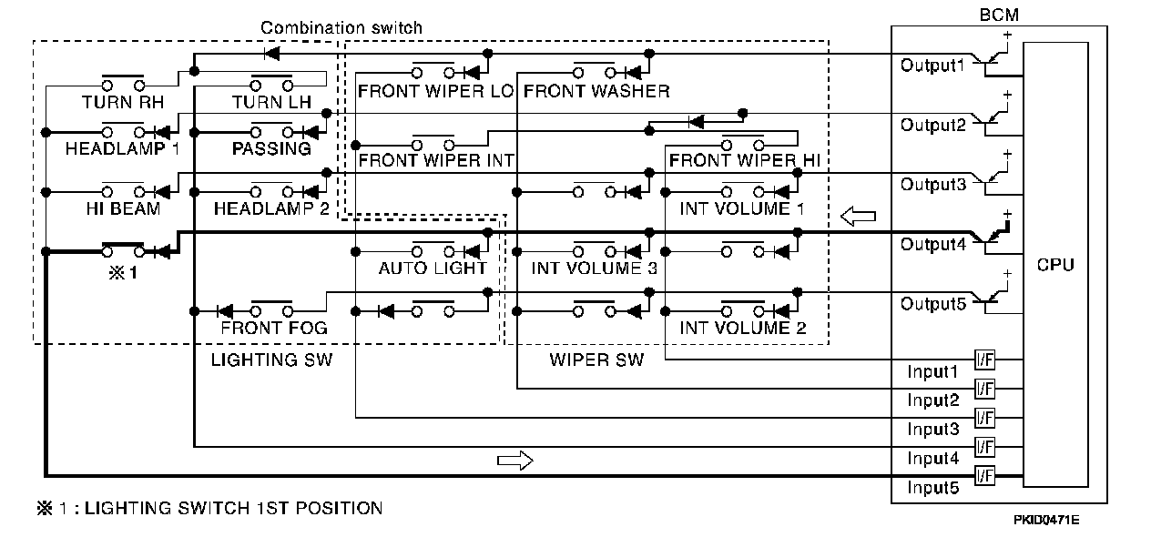 - When lighting switch 1ST position is turned ON, contact in combination switch turns ON. At this time if OUTPUT 4 transistor is activated, BCM detects that voltage changes in INPUT 5.