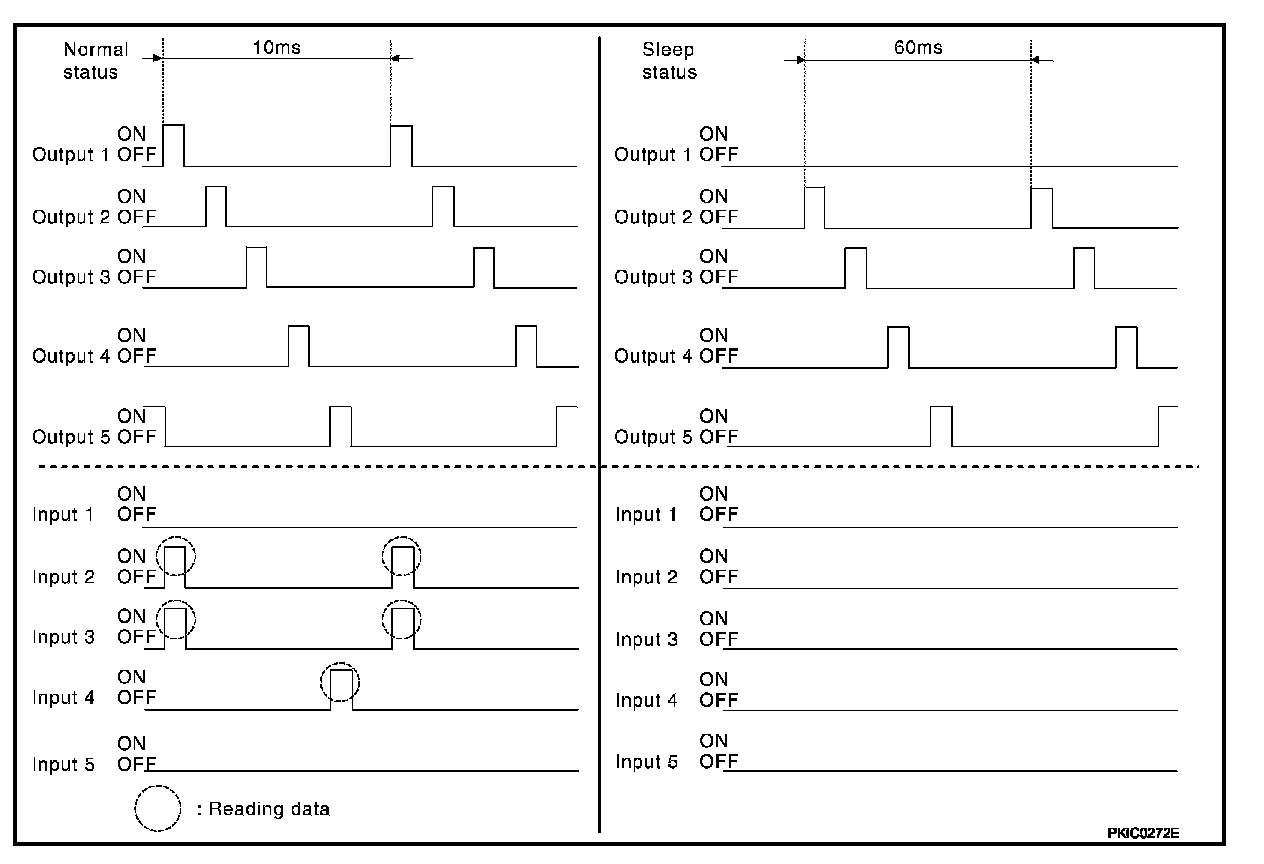 - When BCM is not in sleep status, OUTPUT terminals (1-5) send out ON signal every 10 ms.