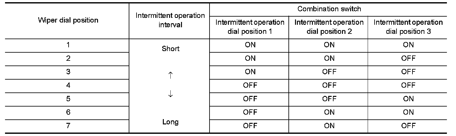 When combination switch status is as listed below, BCM determines that it is wiper dial position 1.