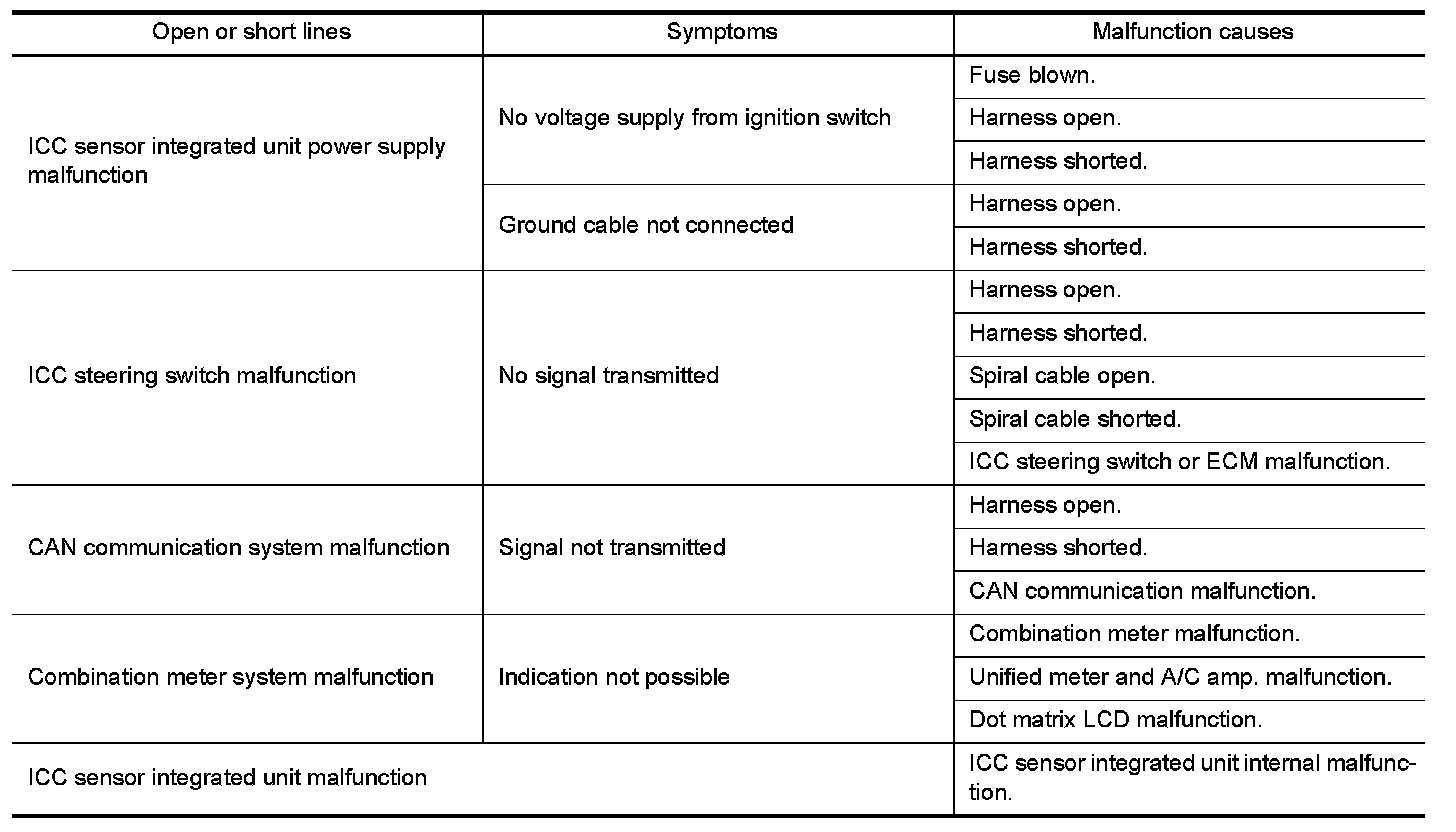 Check ICC steering switch. Refer to ICC Steering Switch.