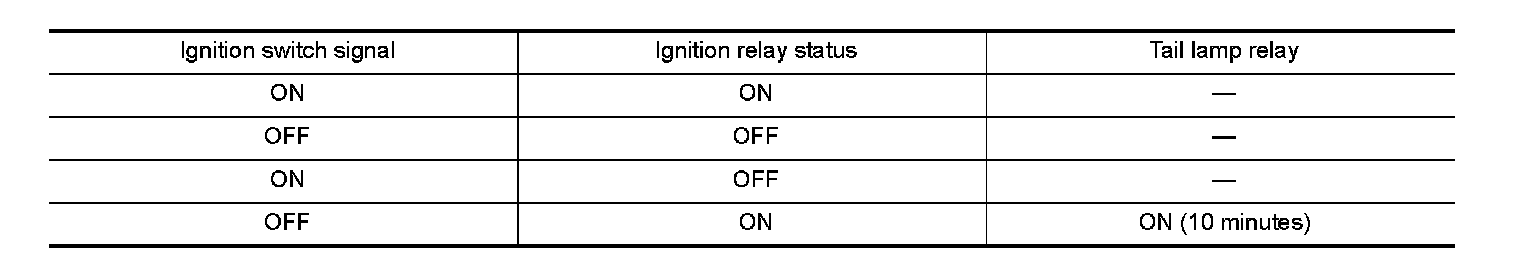 - When contact point of integrated ignition relay is stuck and cannot be turned OFF, IPDM E/R turns ON tail and parking lamps for 10 minutes to indicate ignition relay malfunction.