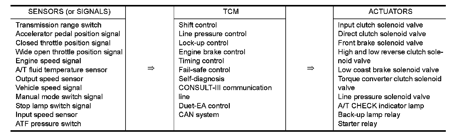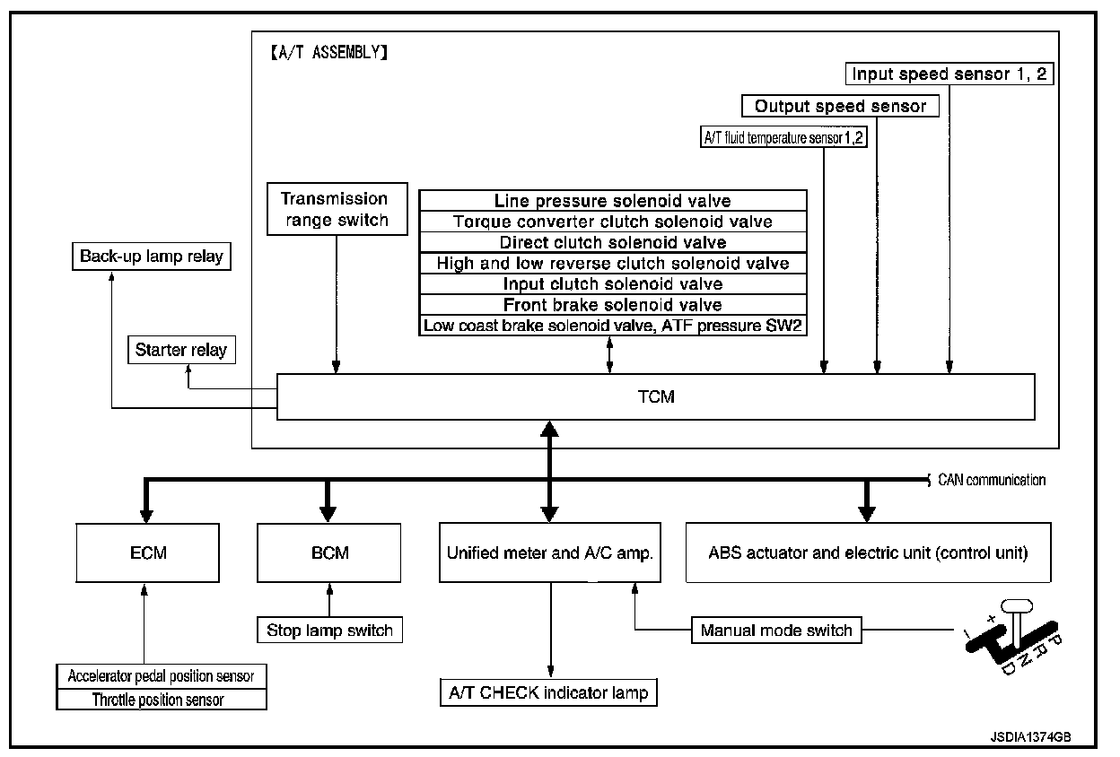 The A/T senses vehicle operating conditions through various sensors or signals. It always controls the optimum shift position and reduces shifting and lock-up shocks.