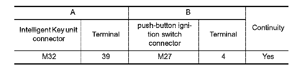 2. Check continuity between Intelligent Key unit connector and push-button ignition switch connector.