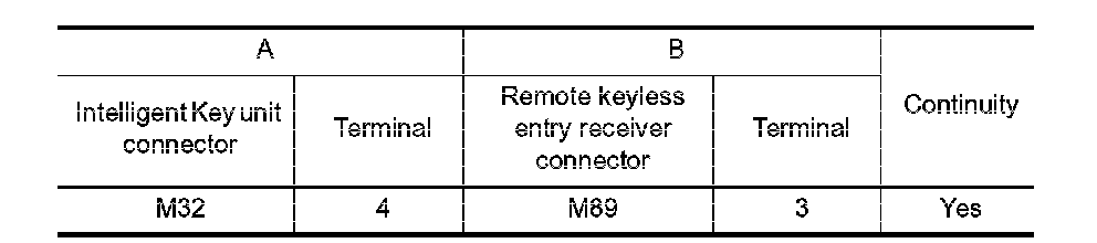 2. Check continuity between Intelligent Key unit connector and remote keyless entry receiver connector.